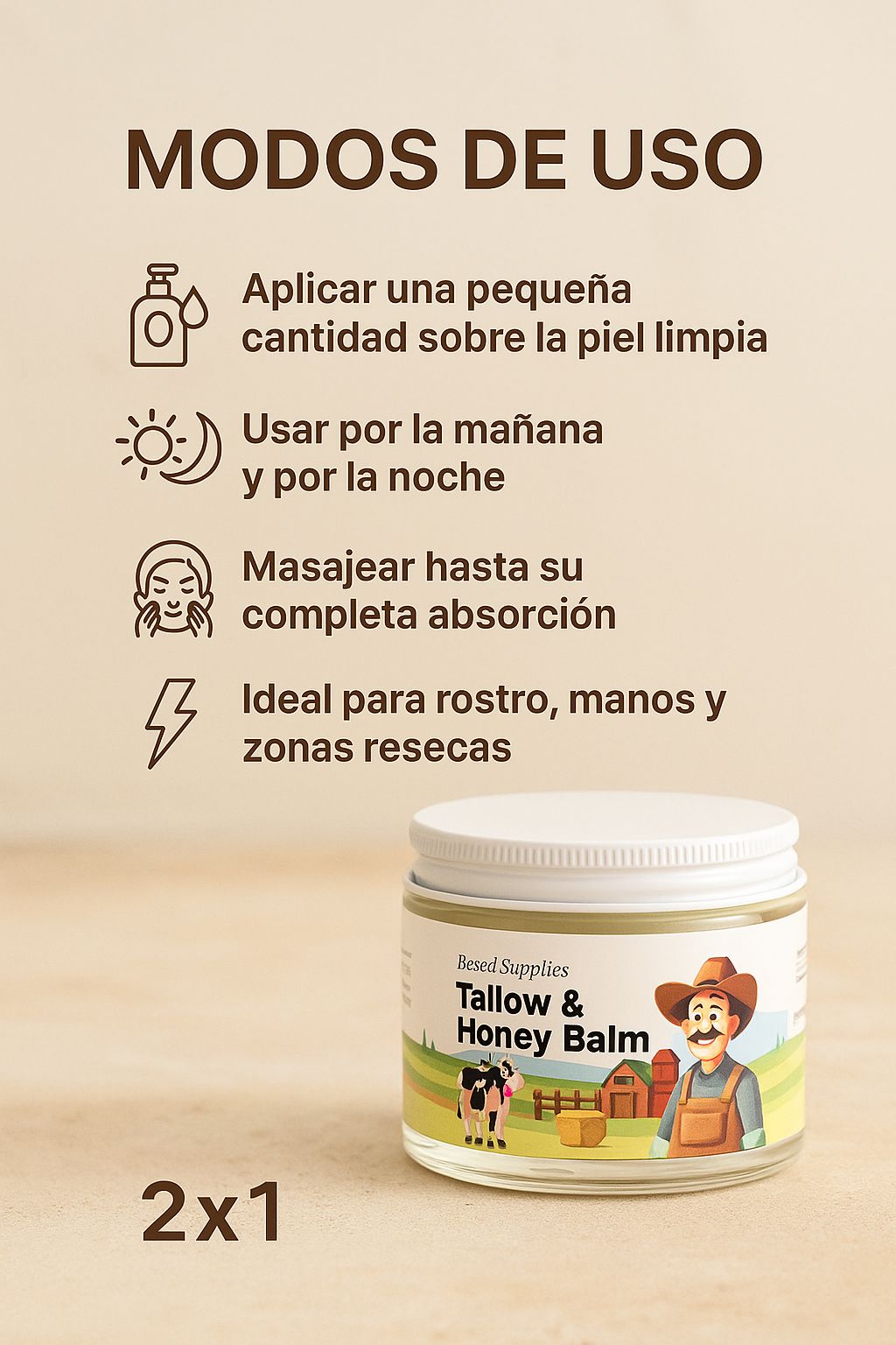 Gracias a su fórmula con sebo alimentado con pasto, miel pura y cera de abejas, ayuda a reducir la resequedad, enrojecimiento, irritación o zonas dañadas, promoviendo una recuperación rápida y visible desde las primeras aplicaciones.
